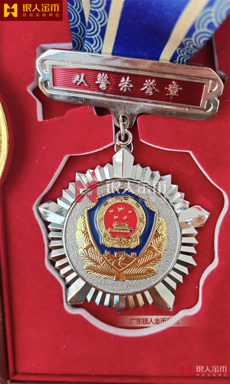 從警紀(jì)念章(公安勛章或警察勛章,也叫人民警察金盾獎(jiǎng)?wù)?/a>或金盾勛章),不僅是一件獎(jiǎng)品,更是一份承載著榮譽(yù)與責(zé)任的象征,它猶如一面鏡子,映射出警察職業(yè)的崇高與莊嚴(yán),也映射出每一位警察內(nèi)心深處的信念與堅(jiān)守。這款從警年限紀(jì)念章以金銀銅三色為主調(diào)分別代表不同入警時(shí)間,象征著警察職業(yè)的莊嚴(yán)與神圣。其造型獨(dú)特,融合了警徽、盾牌與時(shí)間的元素,警徽,代表著警察的身份與榮譽(yù),每一次佩戴,都是對(duì)職責(zé)的堅(jiān)守;盾牌,象征著保護(hù)與守護(hù),是警察們面對(duì)危險(xiǎn)時(shí)無畏前行的勇氣;而時(shí)間的流轉(zhuǎn),則見證了警察們從青澀到成熟,從熱血到沉穩(wěn)的蛻變。