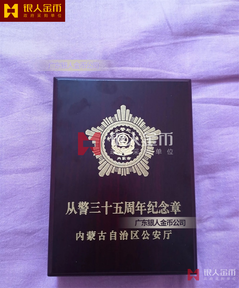 從警紀(jì)念章定制,從警年限紀(jì)念章定制,從警獎(jiǎng)?wù)露ㄖ?/font>——從警紀(jì)念章的底下主體部分都是警徽,上面橫檔部分是不相同的,有:“從警十年紀(jì)念(從警10年紀(jì)念章)”、“從警二十年紀(jì)念(從警20年紀(jì)念章)”、“從警三十年紀(jì)念(從警30年紀(jì)念章)”、“從警四十年紀(jì)念(從警40年紀(jì)念章)”不同的,從警十年紀(jì)念章(從警10年獎(jiǎng)?wù)拢┍砻媸清冦~色(銅質(zhì)獎(jiǎng)?wù)拢?/span>、從警二十年紀(jì)念章(從警20年獎(jiǎng)?wù)拢?/span>表面鍍銀色(銀質(zhì)獎(jiǎng)?wù)拢?/span>、從警三十年紀(jì)念章(從警30年獎(jiǎng)?wù)拢┖蛷木?/span>四十年紀(jì)念章(從警40年獎(jiǎng)?wù)拢?/span>表面鍍金色(金質(zhì)獎(jiǎng)?wù)拢?/span> ,整體將從警獎(jiǎng)?wù)?/font>或從警紀(jì)念章(從警特定年限紀(jì)念章也叫從警章)鑲嵌在三折的立式木盒上面,木盒外面配有紙盒,整體做工精美,木盒紙盒上面都刻有警徽從警年限等。