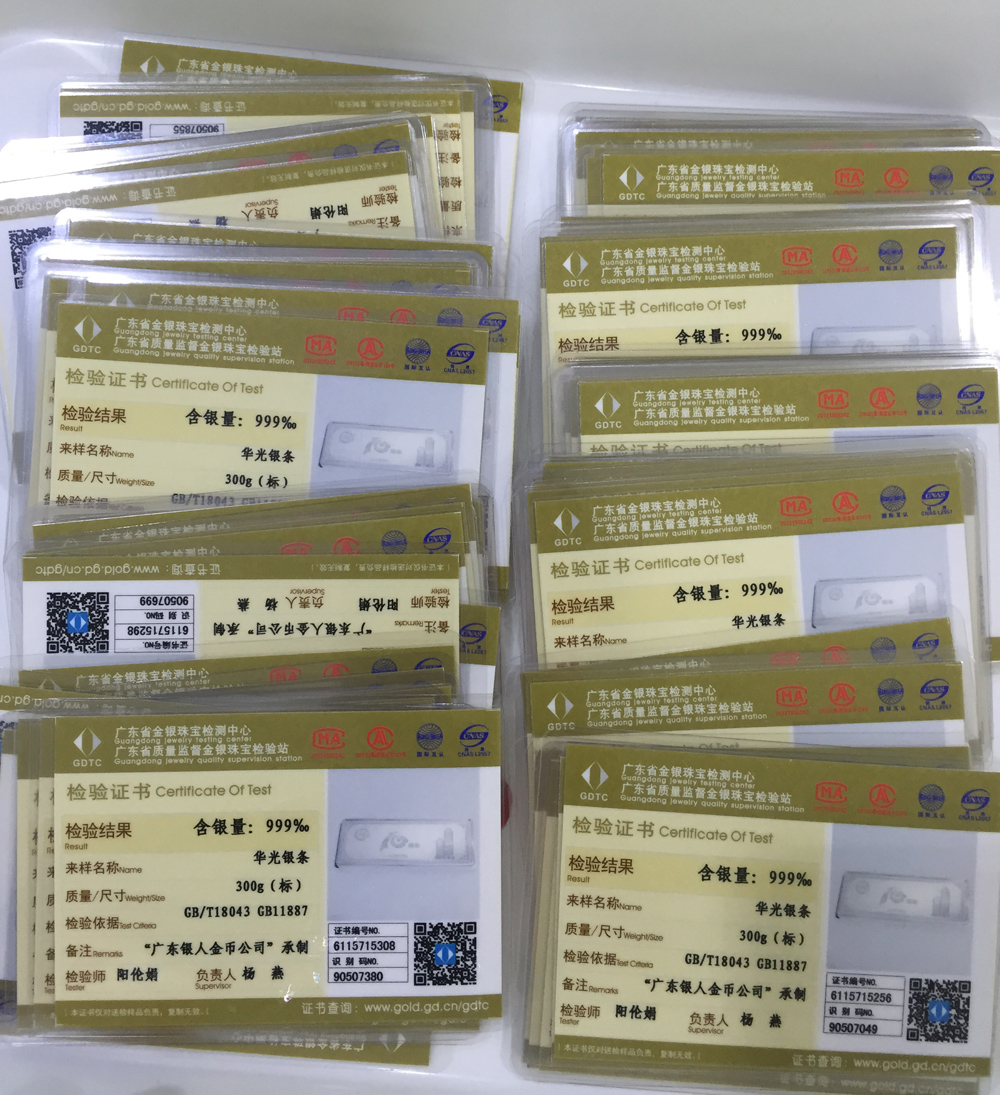 廣東省質監局白銀質量含銀量投資銀條銀磚檢測鑒定證書