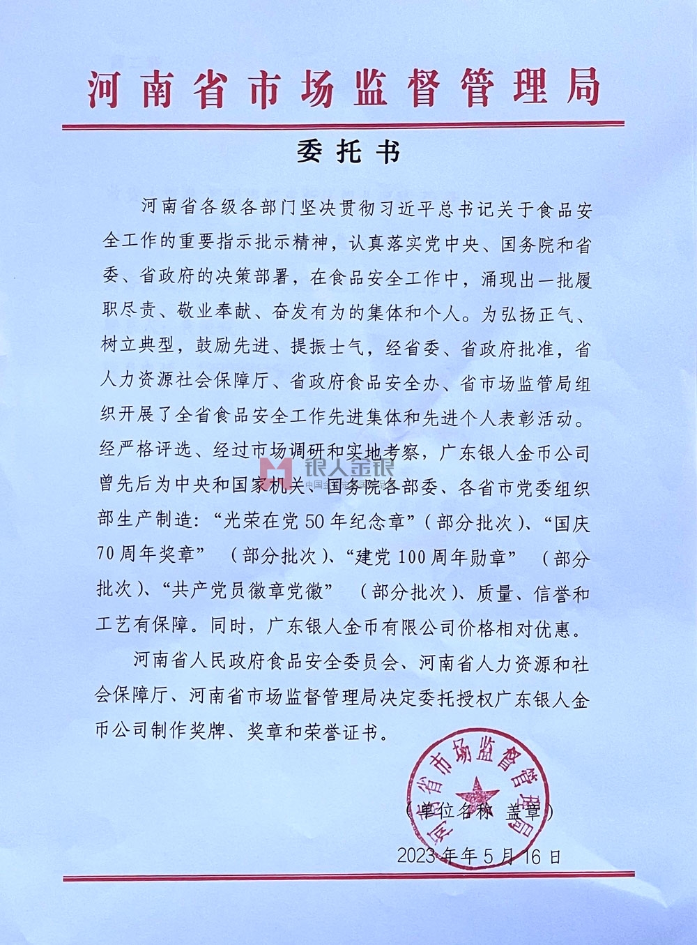 河南省市場監督管理局獎章勛章定制文件公函