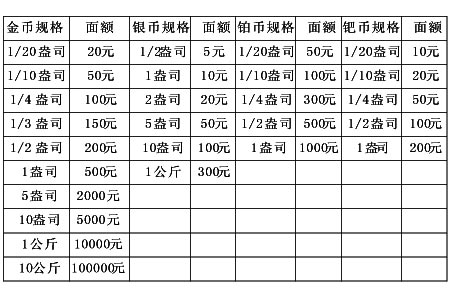 中國(guó)人民銀行自2000年發(fā)行 “千年紀(jì)念”金銀幣開(kāi)始,規(guī)范統(tǒng)一了貴金屬紀(jì)念幣各種材質(zhì)的規(guī)格品種與其標(biāo)注面額的標(biāo)準(zhǔn)。具體見(jiàn)下表: