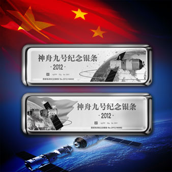 全套含2根50克Ag999銀條,兩根銀條正面分別精心雕鑄有神舟九號飛船與天宮一號環繞地球飛行的風采。特別要說明的是,兩根對接拼合在一起,寓意神舟九號與天宮一號成功對接,中國載人航天成功實現載人交會對接的新突破。兩根銀條正面均鐫刻有“國家標準紀念銀條”字樣和唯一編號,背面均鐫刻有“中國載人航天工程辦公室監制”字樣,全國僅限量發行2012套。