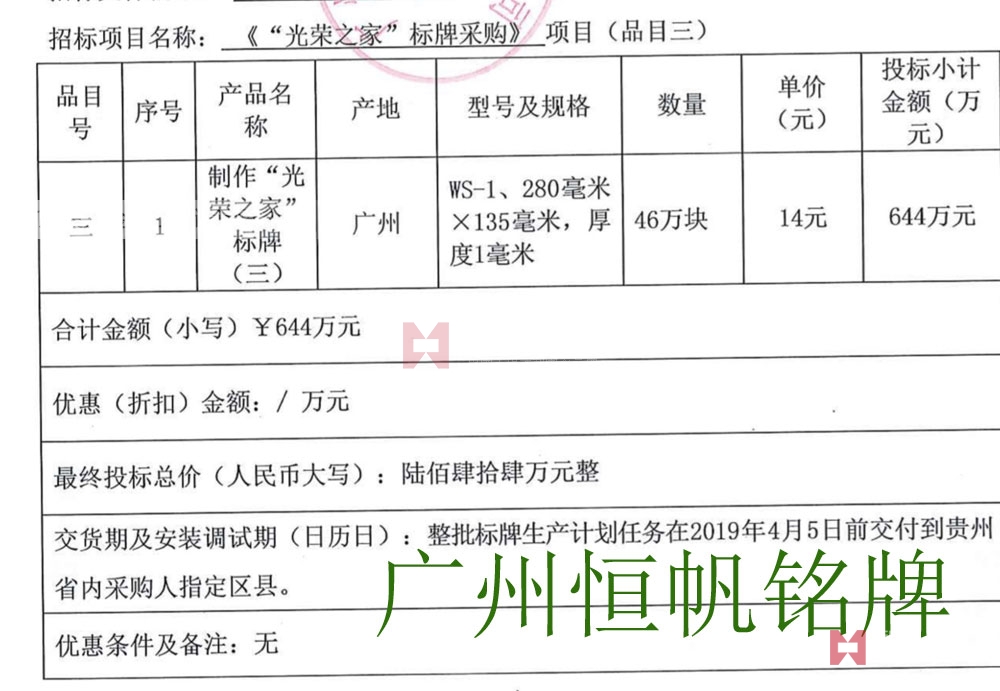 頒發授予光榮之家牌匾/光榮牌采購需求