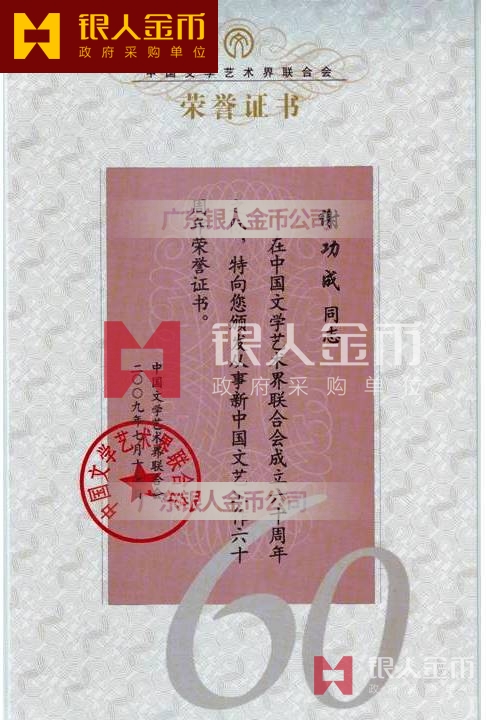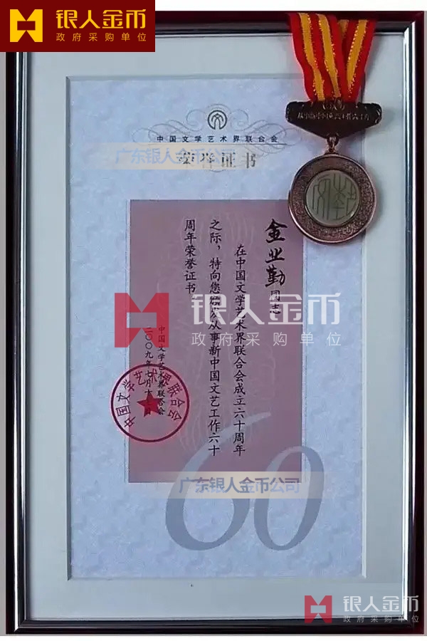 中國文聯從事新中國文藝工作六十年表彰紀念章獎章勛章榮譽證書(圖)