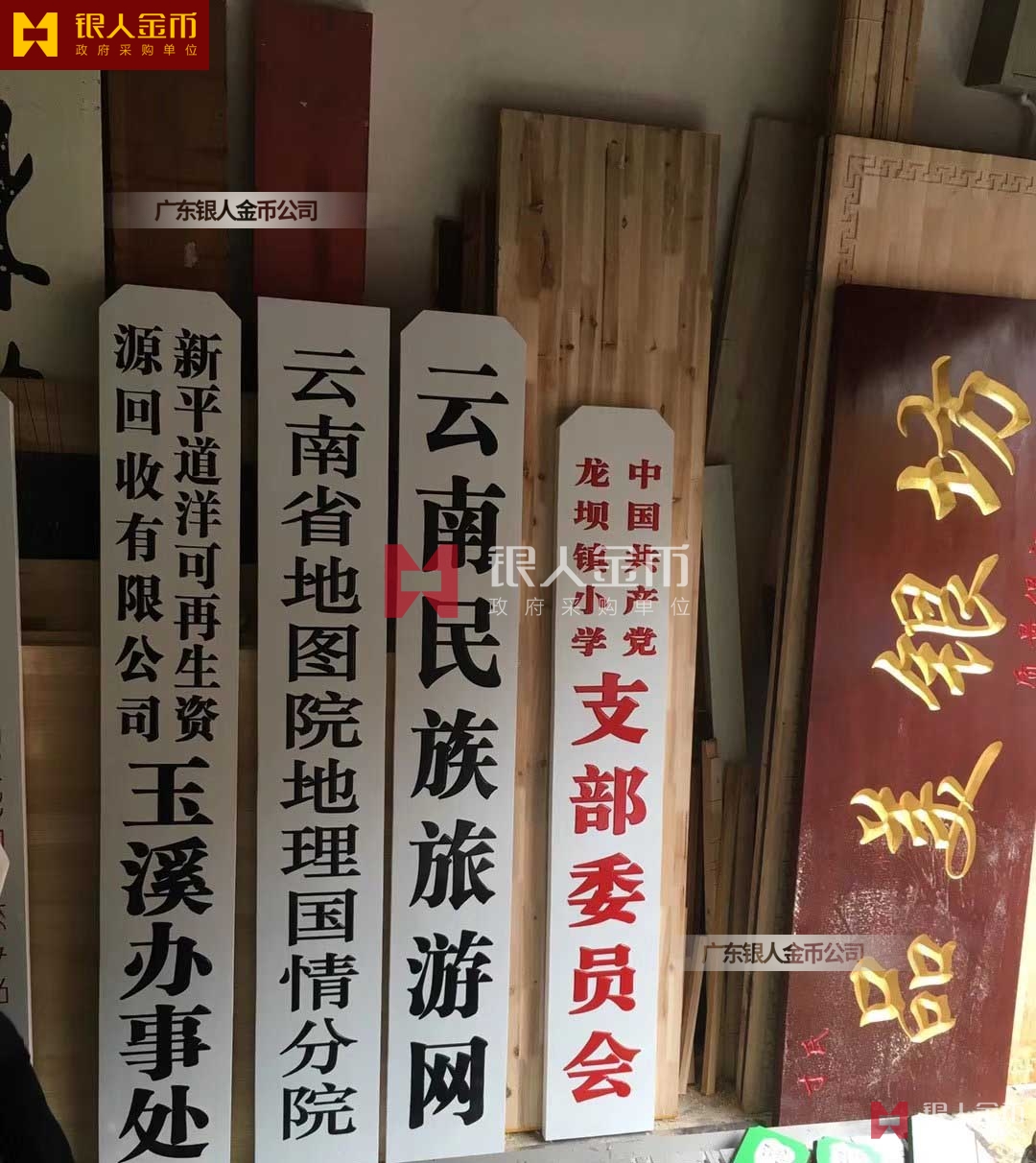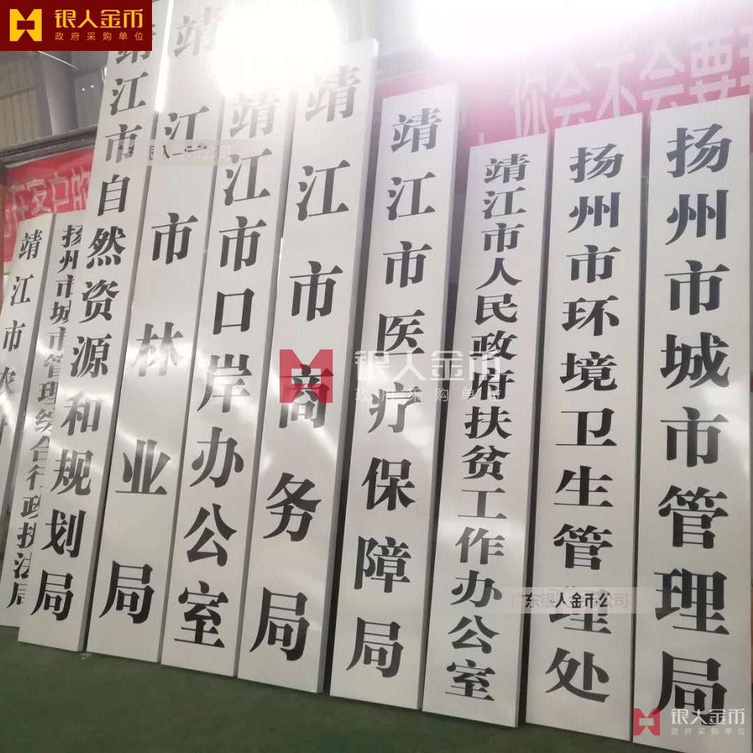 3、標牌大小。縣區黨委、人大常委會、政府、政協委員會、紀委和市直機關部門、人民團體及市委、市政府直屬機構、派出機構條牌高240厘米,寬40厘米;市直代管機構、部門管理機構和縣級事業單位條牌高230厘米,寬38厘米;鄉鎮黨委、人大、政府、街道辦事處和縣區機關部門、人民團體及縣區黨委、縣區政府直屬機構、派出機構條牌高220 厘米,寬36厘米;縣直代管機構和科級事業單位條牌高215厘米,寬34厘米;縣級事業單位方牌高60厘米,寬80厘米;科級事業單位方牌高40厘米,寬60厘米;鄉鎮辦、站、所方牌高40厘米,寬60厘米;各級內設機構門牌高12厘米,寬30厘米。