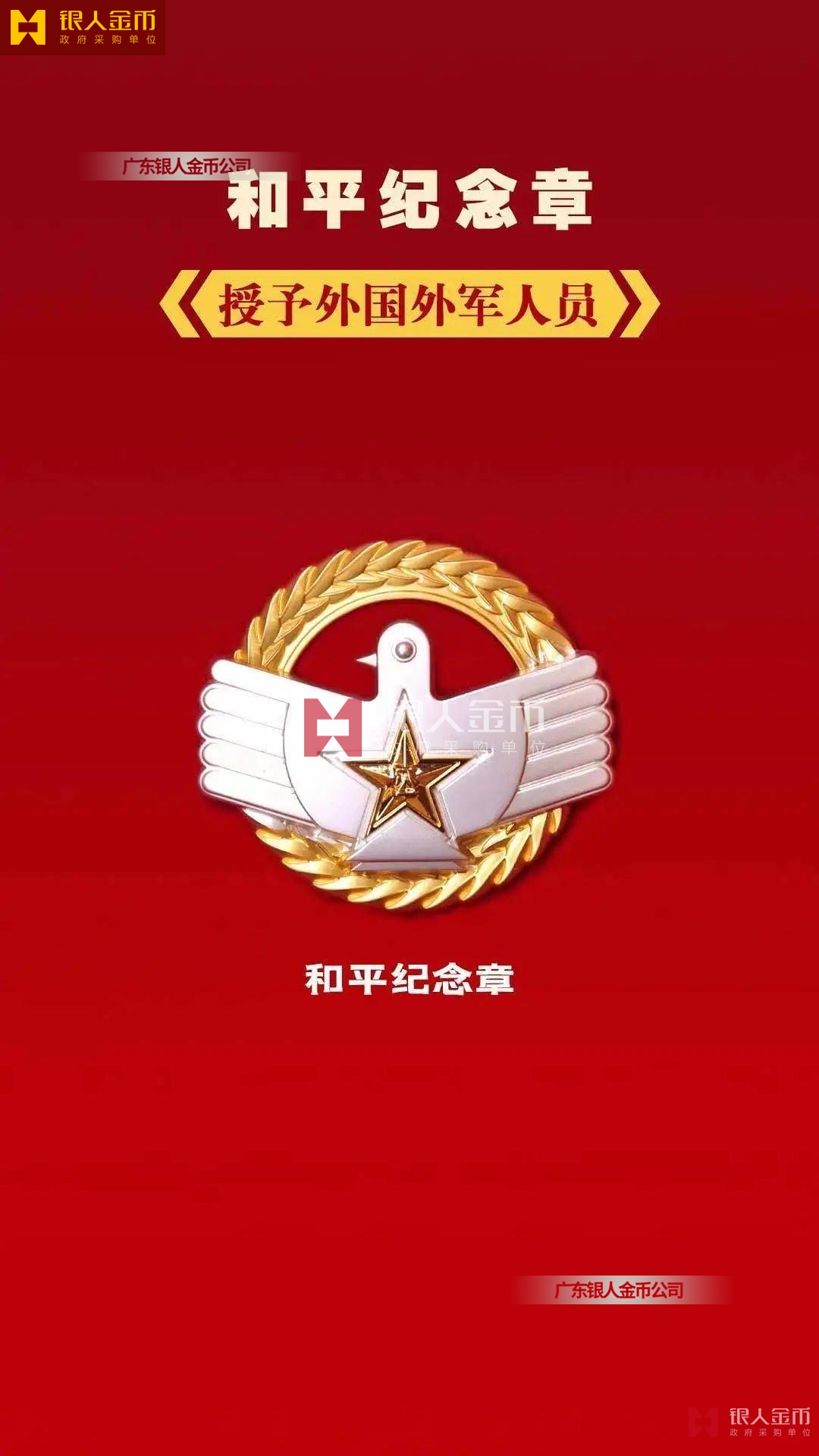 和平紀念章,由軍徽、和平鴿等元素構(gòu)成,授予外國外軍人員,通徑為35mm。