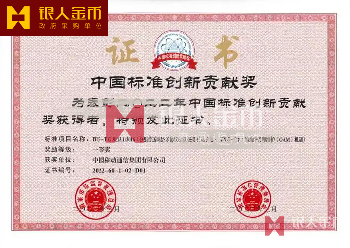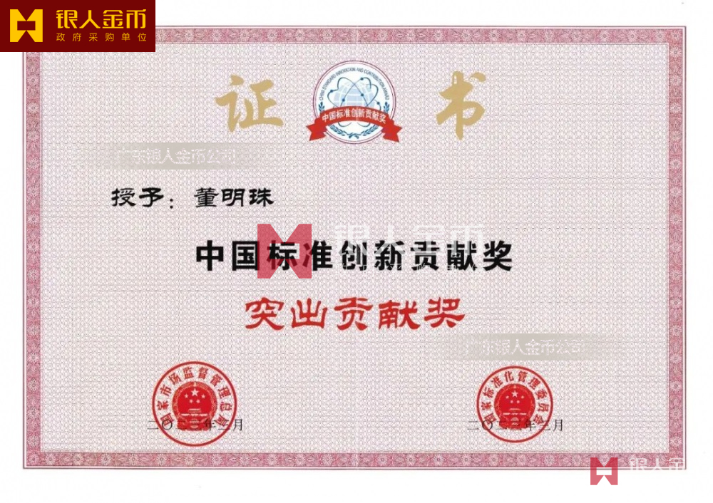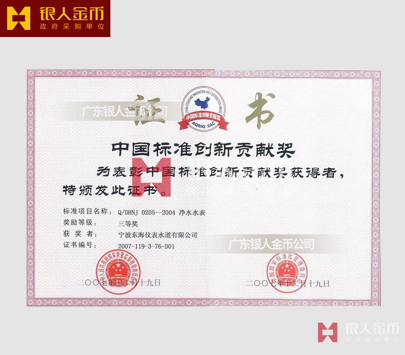 國家市場監管總局(國家標準委)負責中國標準創新貢獻獎獎牌證書(圖)