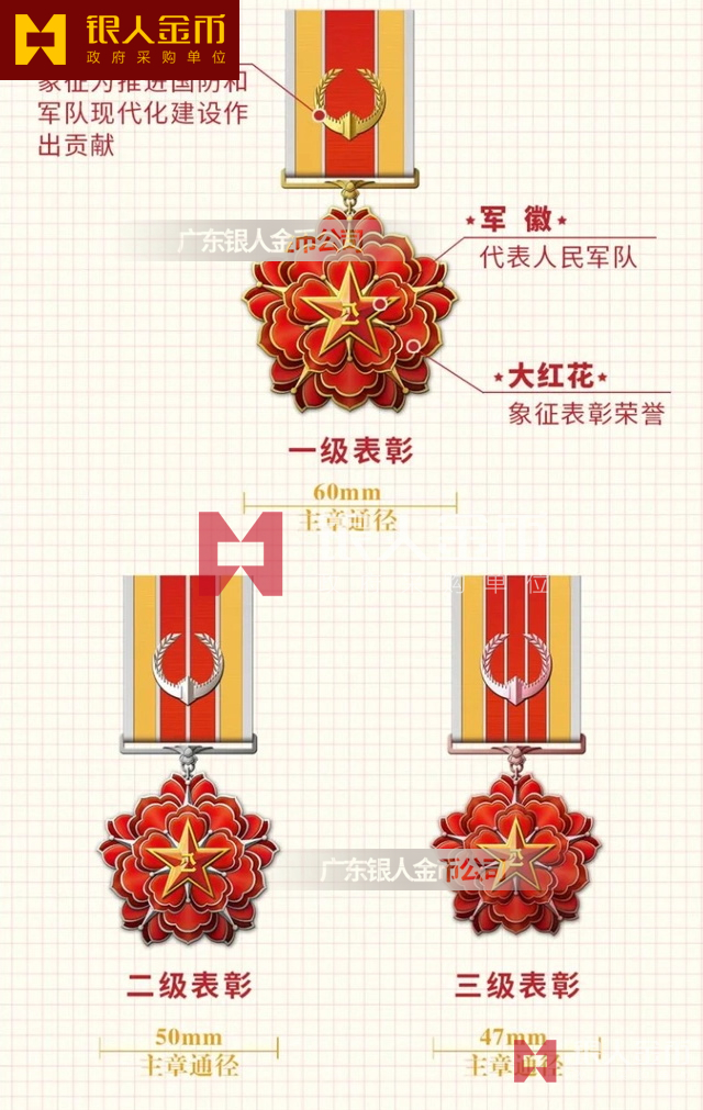 近日,《軍隊功勛榮譽表彰條例》印發,同步啟用新時代軍隊勛章、獎章、紀念章:①勛章。包括“八一勛章”“紅旗勛章”“紅星勛章”“和平勛章”,主章通徑均為65mm。②獎章。包括榮譽稱號獎章、獎勵獎章、表彰獎章、和平獎章。③紀念章。包括平時紀念章、和平紀念章和其他紀念章。中央軍委最新版新時代部隊戰區榮譽稱號軍隊勛章、獎章、紀念章(定制標準)
