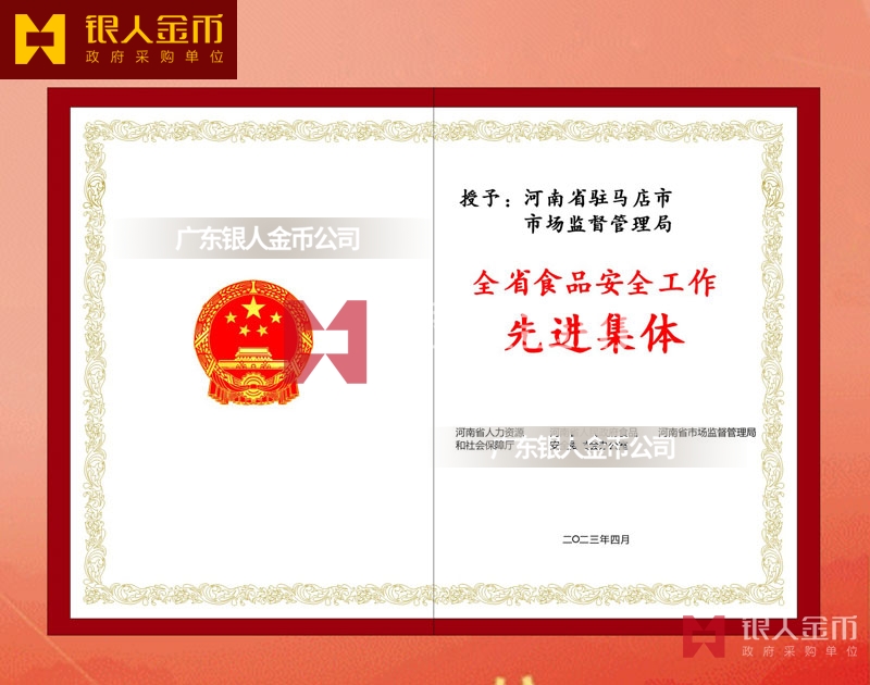 河南省政府食品安全工作先進集體獎牌定制_全省食品安全工作表彰牌匾制作_獎勵牌匾訂制_先進集體木板底托銅牌制做_貼紅木板鈦金獎牌定做_貼紅木仿紅木托底鈦金牌匾額匾牌