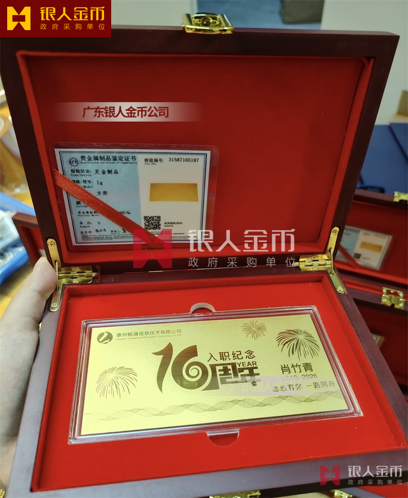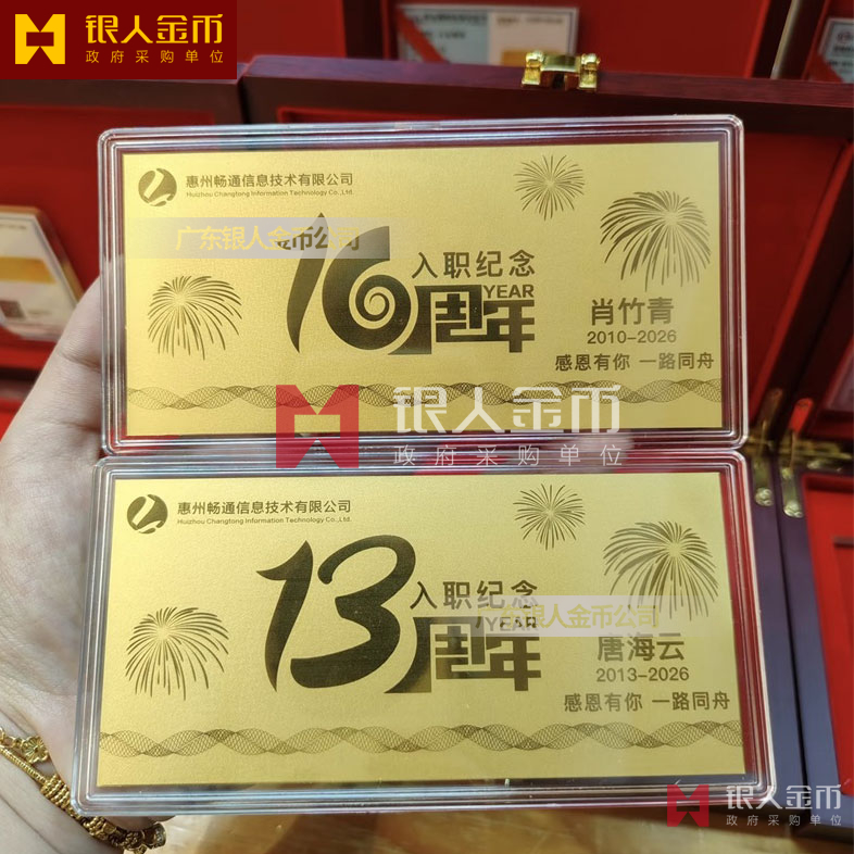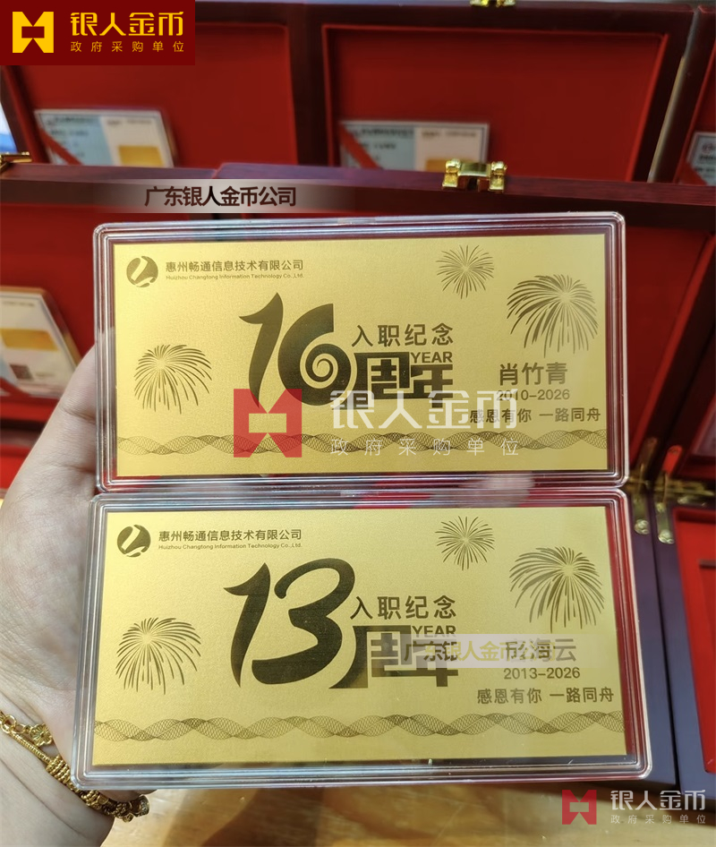 惠州暢通信息公司員工入職10周年紀念黃金金卡定制_純金金卡定制_千足金紀念卡定制_千足金金卡定制_入職紀念金鈔定制